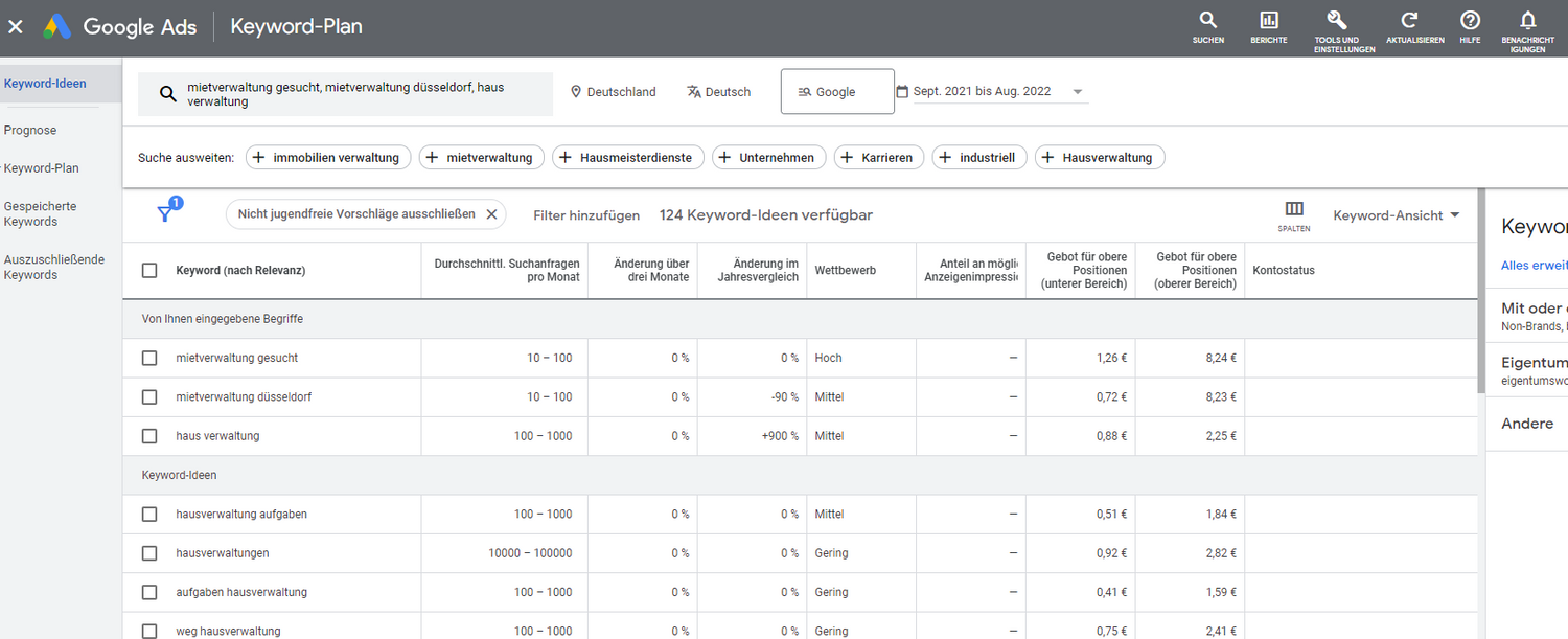 SEO Maßnahme Keywordrecherche: Suche nach einem passenden Keyword. Ein Keyword ist ein Schlüsselwort, nachdem Du Deinen Beitrag ausrichtest. Wenn du z. B. eine Mietverwaltung bist und neue Objekte akquirieren möchtest, dann schaue vorher nach, worüber Du schreiben möchtest und welches Keyword Du am besten dafür nutzen kannst und welche Inhalte derzeit im Netz gesucht werden.