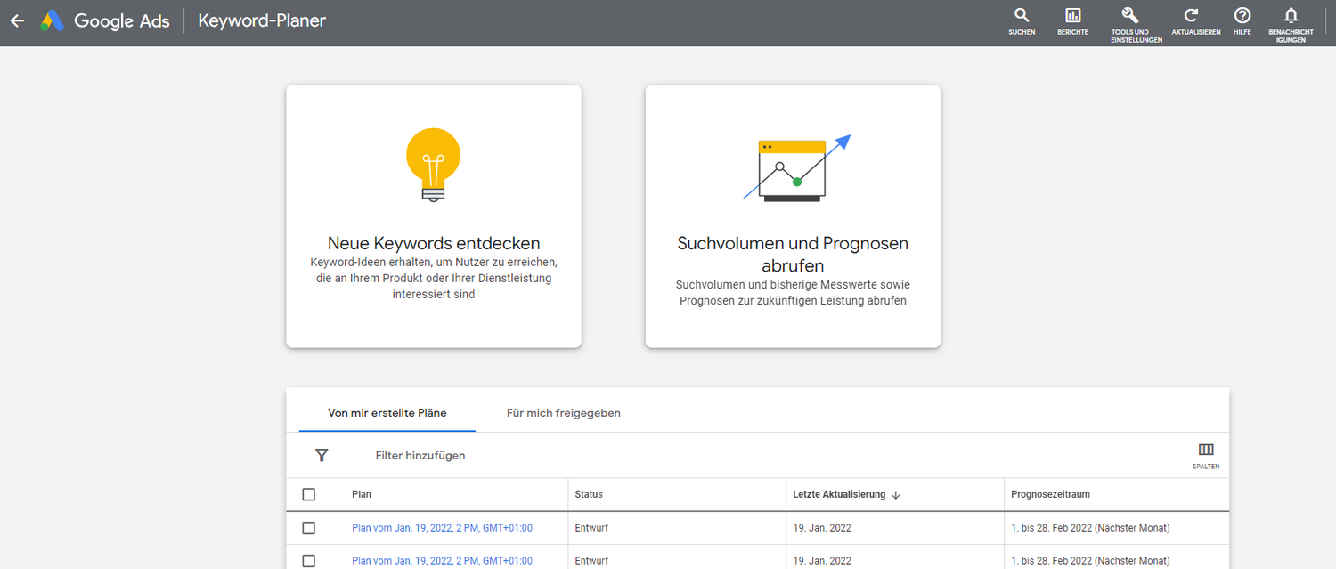Hier siehst Du zwei Screenshots, wie der Keyword Planner von Google aussieht. Im 2. Bild habe ich dann bereits nach Beispiel-Keywords suchen lassen.