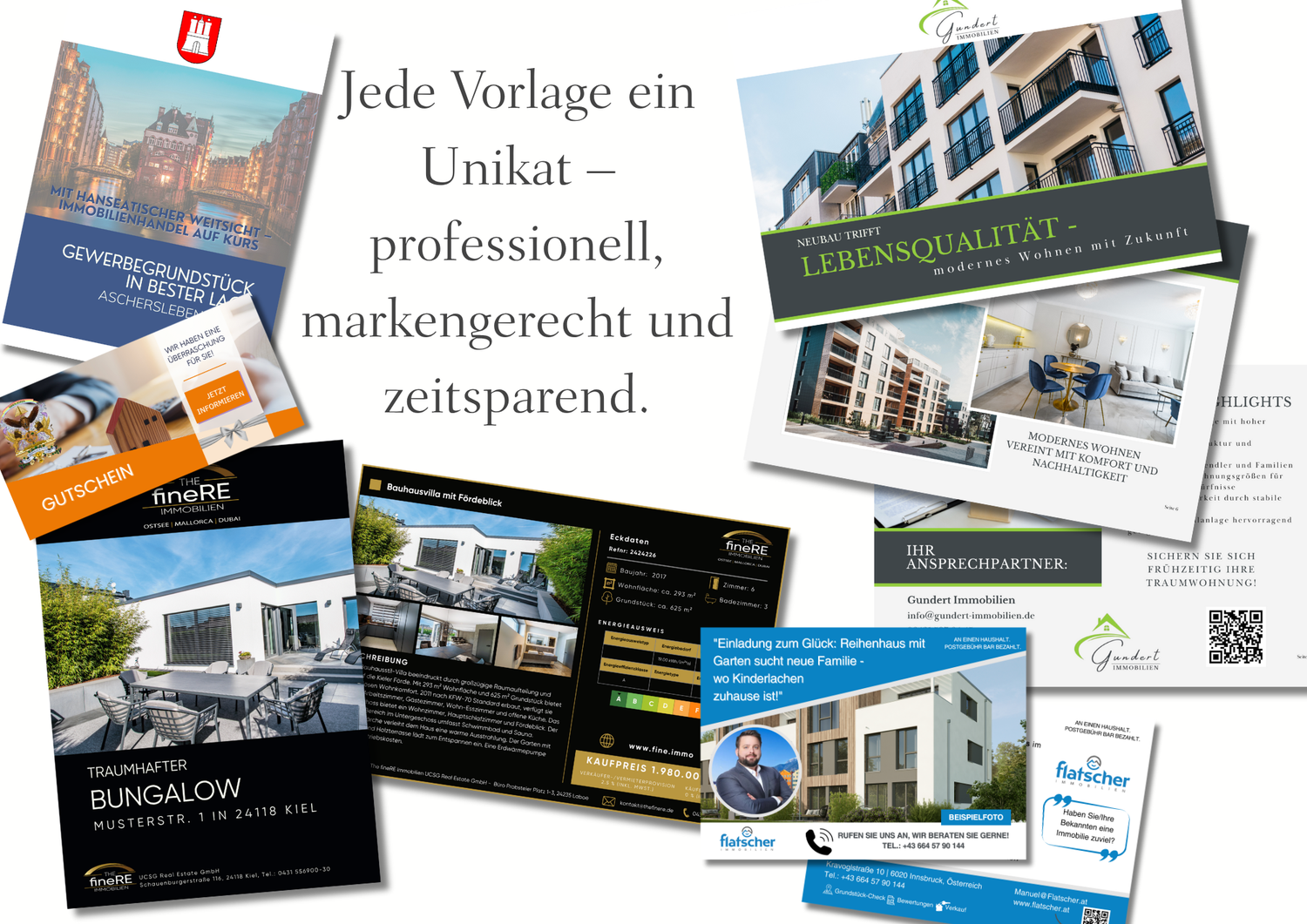 Manche Kunden beauftragen mich gezielt für einzelne Designs – etwa ein hochwertiges Exposé, eine Imagebroschüre oder Vorlagen für Social Media. Andere entscheiden sich für ein umfassendes Marketingpaket, das ich individuell auf ihre Marke zuschneide.